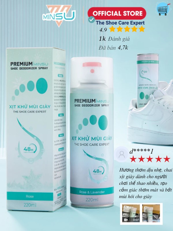 Xịt khử mùi giày MINSU hương oải hương, xịt khử mùi giày MINSU hương hoa hồng có chứa nano Ag+ giúp khử mùi giày hiệu quả. Ngoài ra còn giải phóng triệt để môi trường sống của vi khuẩn gây mùi, gây ẩm mốc trong thân giày. Giúp đôi giày của bạn lưu hương thơm thật lâu trong 48h mà không hề gây hại cho da.